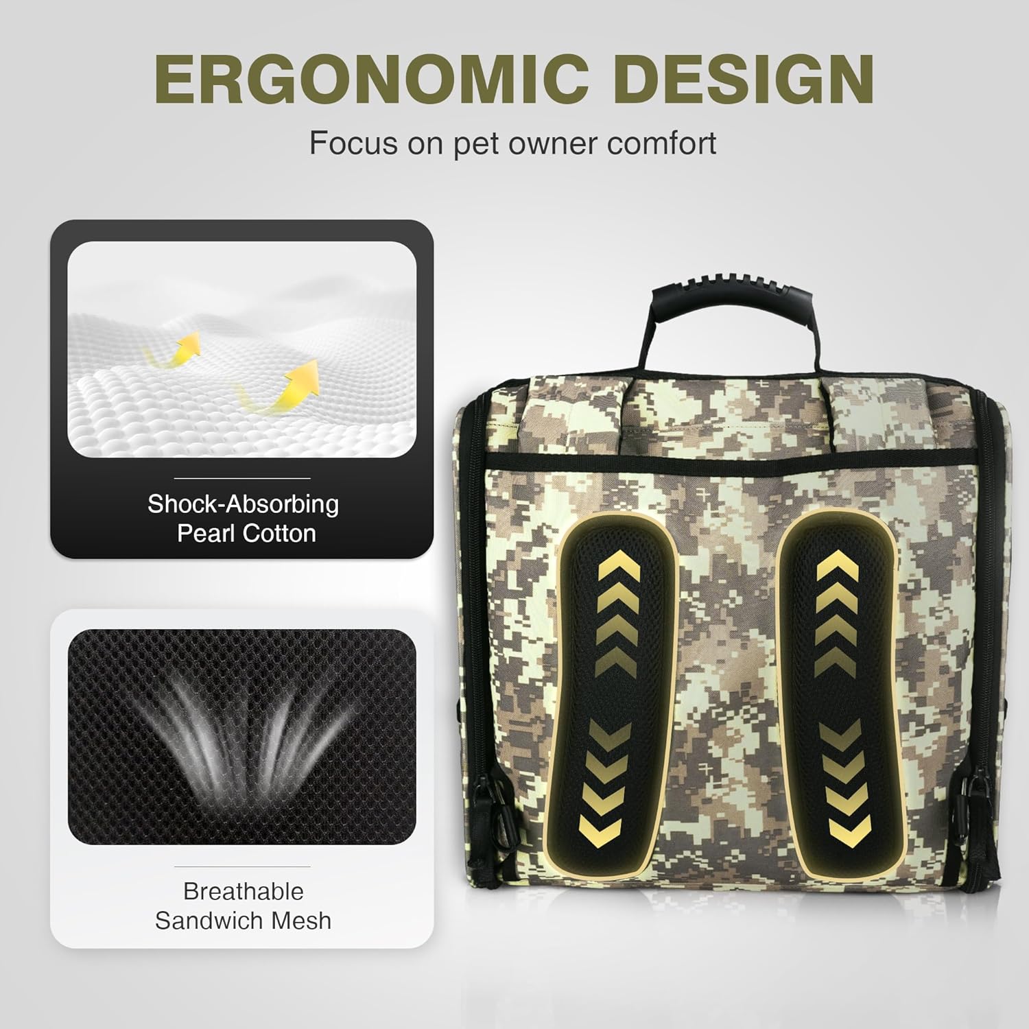 Ergonomic Design: The shoulder straps and the back of the backpack dog carrier are made of pearl cotton, which has a cushioning effect and can effectively absorb shock and vibration and reduce back pressure. External wrapping sandwich mesh, which has good breathability, can effectively reduce back sweating. The seven-wire handle on the top of the cat backpack provides multiple grip points, and effectively dispersing the pressure on the hand, thereby enhancing grip.