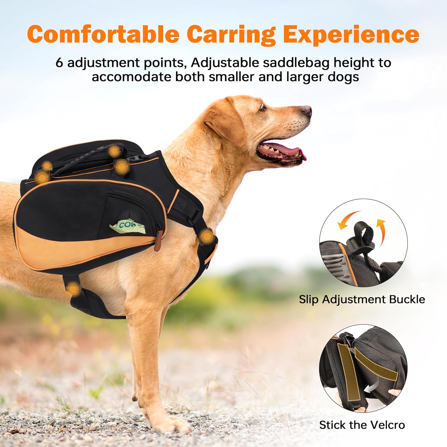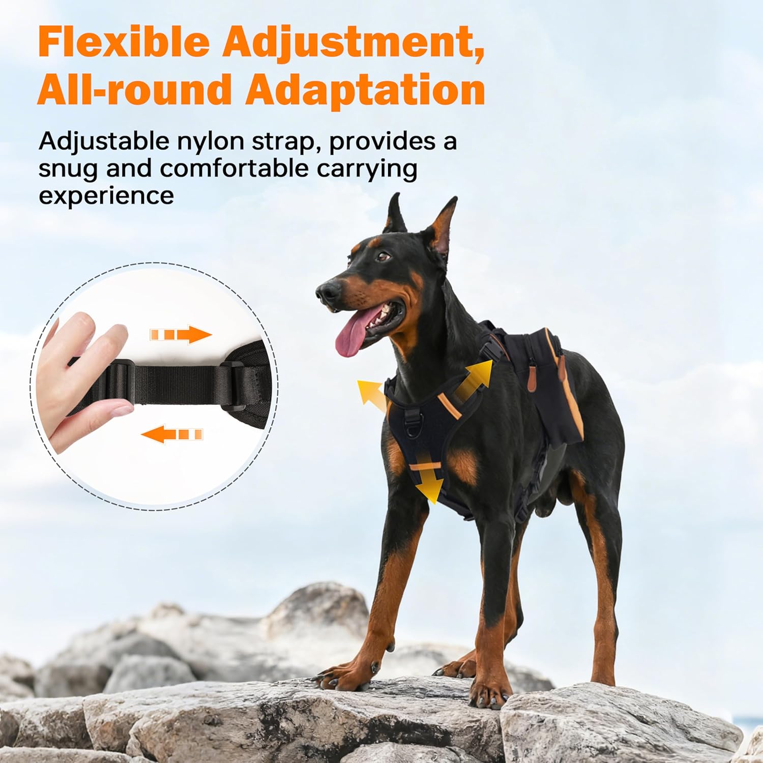 Adjustable pack positioning: Each side pack mounts through a rectangular adjuster so the attachment points can slide up or down to match the dog’s shoulder height and back length, improving weight balance and walking stability.