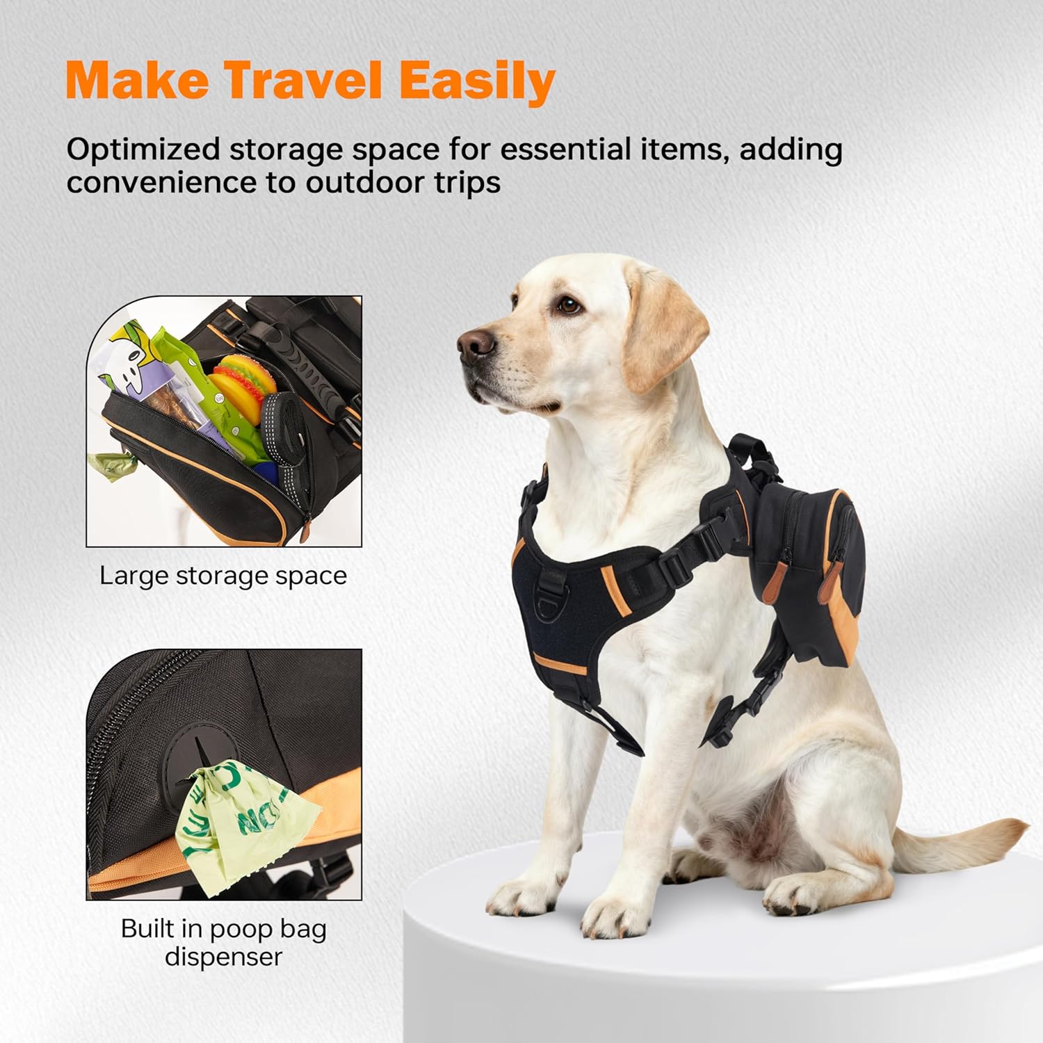 Designed for outdoor travel with mid- to large-breed dogs, Outdoor backpack designed specifically for medium to large dogs combines an adjustable harness with dual side packs to balance load, free your hands, and keep essentials close. The system fits a wide range of canine builds thanks to flexible strap geometry and vertically adjustable pack mount points, delivering a stable, comfortable carry on varied terrain.
